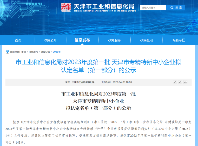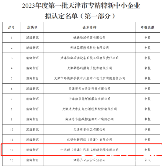 2023年4月3日,天津市工業和信息化局發布了對2023年度第一批天津市專精特新中小企業擬認定名單(第一部分)的公示,中汽研(天津)汽車工程研究院有限公司(以下簡稱“中汽中心工程院”)成功入選。