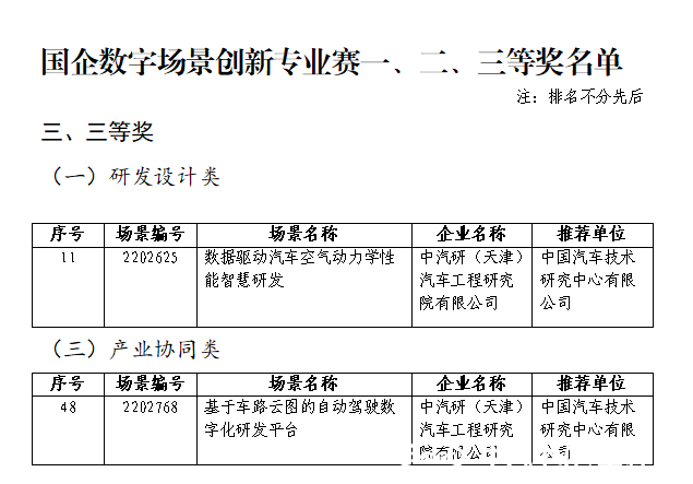 為深入貫徹落實黨中央、國務院關于加快數字化發展的決策部署,國務院國資委于2022年舉辦首屆“國企數字場景創新專業賽”。中汽研(天津)汽車工程研究院有限公司積極參與此項賽事,最終在兩個參賽場景斬獲佳績——《數據驅動汽車空氣動力學性能智慧研發》榮獲“研發設計類”賽段三等獎,《基于車路云圖的自動駕駛數字化研發平臺》榮獲“產業協同類”賽段三等獎。