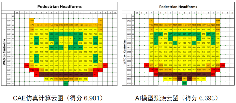 AI模型在新版車型測試集中的擬合優度(R-squared)達到87%以上。對比行人頭部的碰撞點的HIC值的CAE仿真結果和AI預測結果,可以看出,AI模型的預測精度處于較高水平,預測的得分云圖精度達到85%以上,總得分精度達到96%以上。