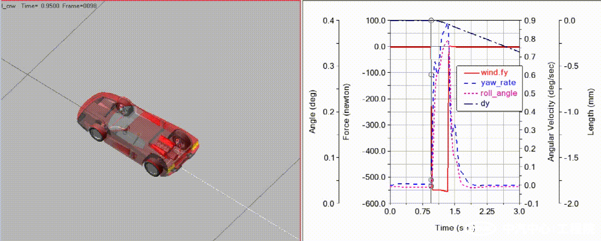 側風穩(wěn)定性底盤動力學仿真分析是基于底盤動力學參數及側風風洞準穩(wěn)態(tài)測試結果建立包含空氣動力學特征的仿真模型,參照《GB/T 41722-2022道路車輛側風敏感性風機輸入開環(huán)試驗方法》與企業(yè)個性化定制側風測試工況進行整車側風穩(wěn)定性仿真分析和優(yōu)化。同時,可以面向主動轉向技術的側風工況控制進行控制系統(tǒng)聯合仿真和參數標定。