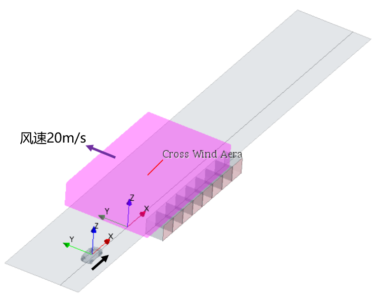 根據實際的側風測試試驗場建立數字側風試驗場,可以通過空氣動力學側風穩(wěn)定性仿真分析可在車型開發(fā)的早期階段僅通過車身外表面數據(CAS面/A面)以及測試車速、重心位置(軸荷比)、輪胎側偏剛度、載荷等信息,模擬實側風道路試驗中車輛的整個側偏過程以及風區(qū)內流場的變化過程,且可為車身外表面優(yōu)化方案的提出提供數據支持。
