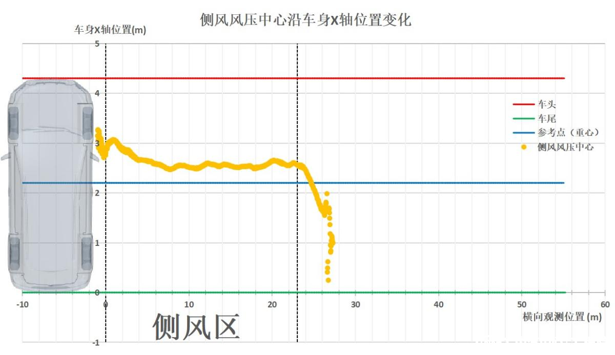 數字側風試驗場可以還原真實的瞬態(tài)測試過程,可以得到該過程中的流場變化的同時可獲得車輛在進出風區(qū)過程中的側風風壓中心(即側向氣動力中心)相較于車身位置的實時變化。