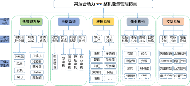 以某混合動力工程機械為例,由工程院風洞中心自主開發了涵蓋零部件、系統和整車等三層級,涉及混合動力行駛系統、純電驅動機械作業系統、電機驅動冷卻系統、電池熱管理系統、駕駛室制冷與采暖系統以及控制系統的多系統整機能量管理一體化仿真平臺,可以進行以下方面的仿真分析: