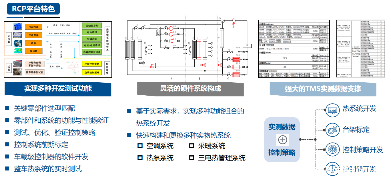 熱系統及零部件性能開發和匹配:該快速控制原型平臺搭建了靈活的實物熱系統臺架,配置多種通用的空調回路和水回路接口,可快速實現多種功能組合的熱系統構型開發。同時該平臺安裝了豐富的熱系統傳感器和測試數據采集模塊,可對熱系統實物臺架進行系統級和零部件級的性能測試。