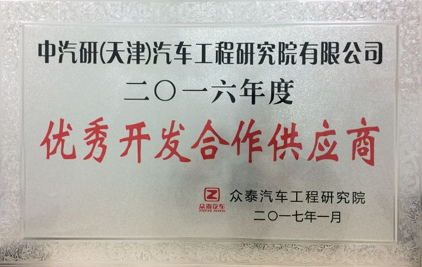 中汽中心汽車工程研究院被眾泰汽車評(píng)為“2016年度優(yōu)秀開發(fā)合作供應(yīng)商”
