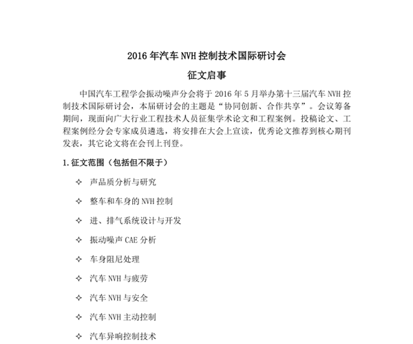 2016年汽車NVH控制技術國際研討會征文啟事