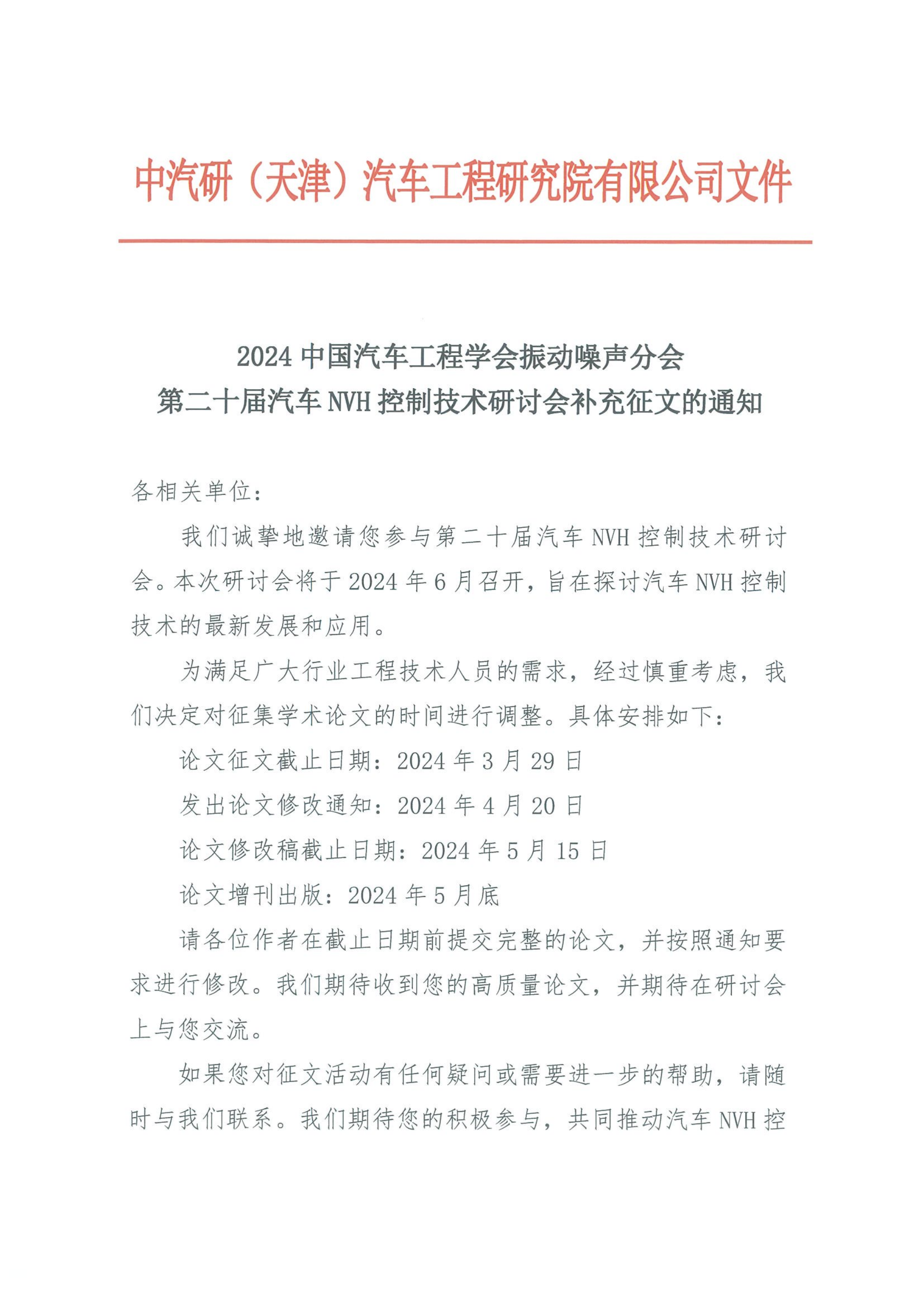 2024中國汽車工程學會振動噪聲分會 第二十屆汽車NVH控制技術研討會補充征文的通知